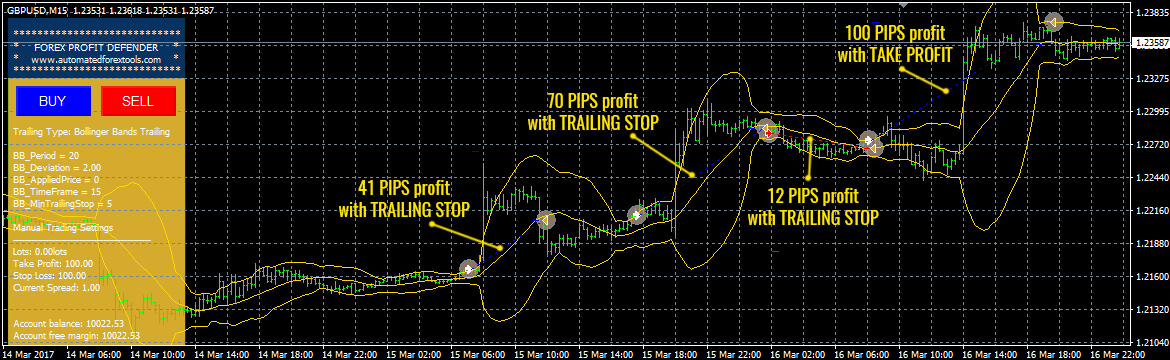 You can check the above image where we have tested the robot in real conditions with Bollinger Bands Trailing Stop. We have managed to make 223 PIPS profit trading manually for less than 2 days. More details about the avilable settings for Bollinger Bands Trailing Stop you can find in the user guide of Forex Profit Defender.